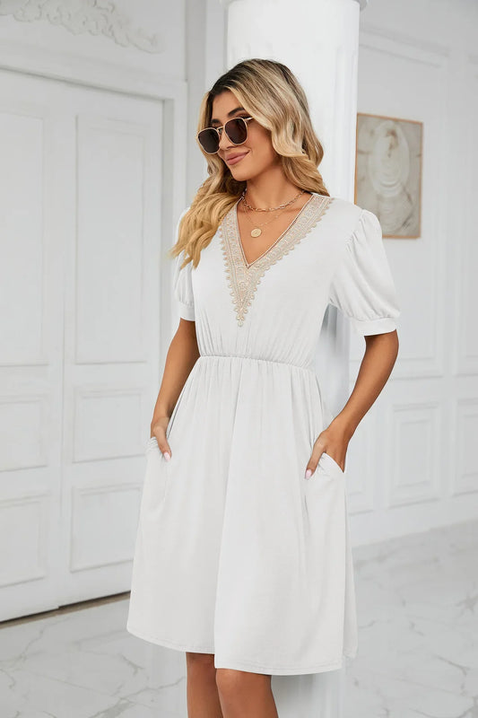 91.58 CHFMonika® I Schlichtes Spitzen-Patchwork-Kleid für die warme Jahreszeit