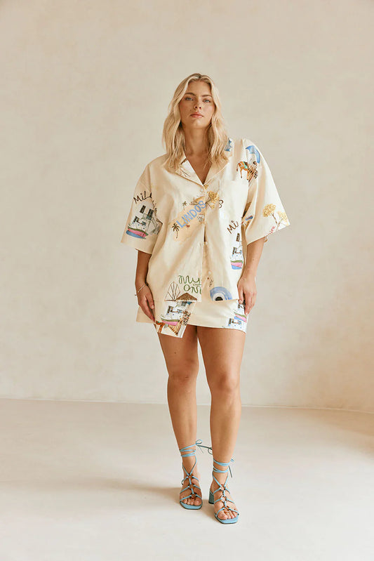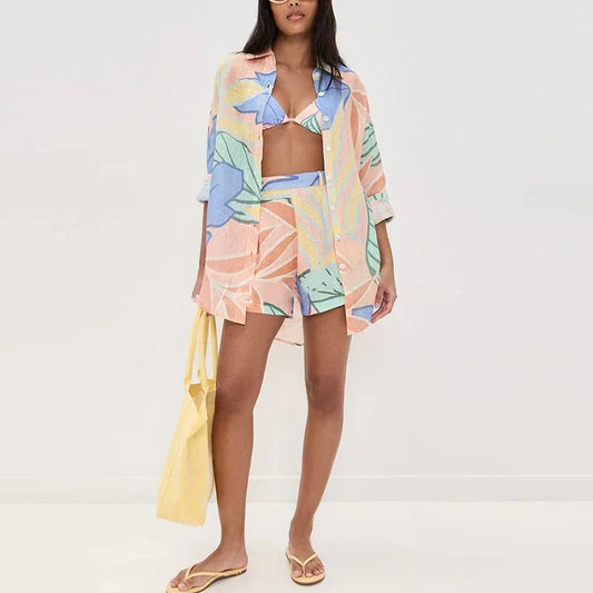 65.99 CHFDamen Leinenmischung Bedruckte Bluse und Locker sitzende Shorts mit elastischem Bund Set