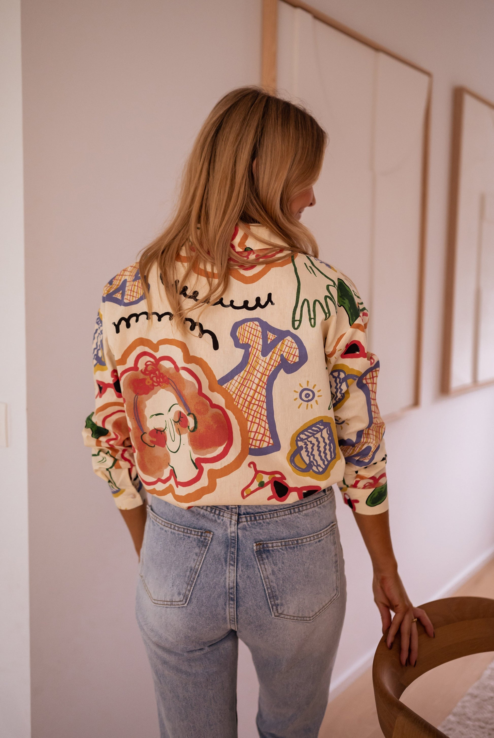 Genießen Sie mühelosen Stil mit dieser langärmligen Bluse, die mit einem markanten, künstlerischen Muster verziert ist und jedes Stück zu einem echten Unikat macht. Hergestellt aus weicher, atmungsaktiver Baumwolle, bringt sie entspannten Komfort in Ihre Alltagsgarderobe. Kombinieren Sie sie mit Ihrer Lieblingsjeans oder einem fließenden Rock, um einen individuellen Look zu kreieren, der Charme und Vielseitigkeit vereint.