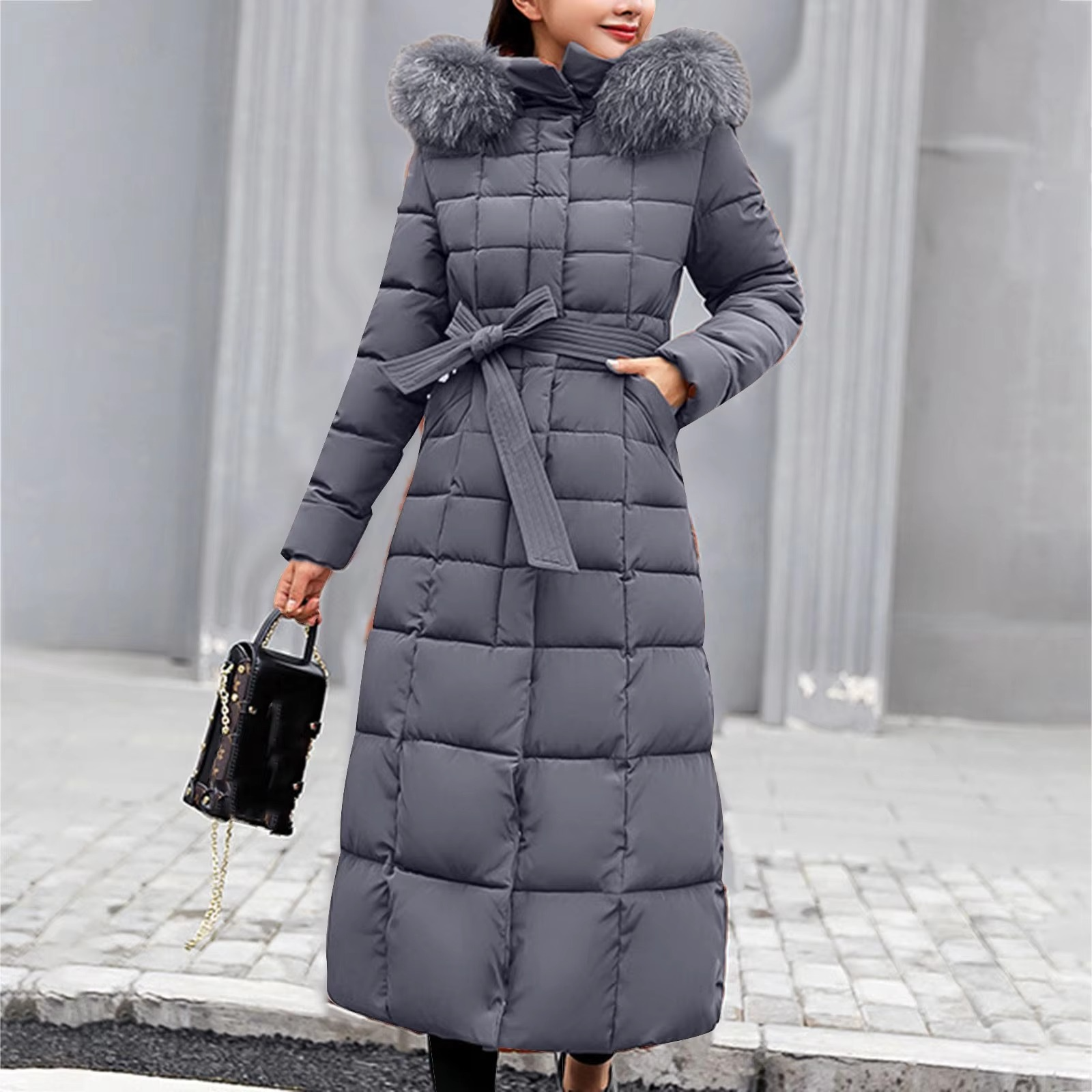 Stellen Sie sich vor, wie Sie in die frische Luft treten, eingehüllt in die sanfte Umarmung eines langen, gesteppten Mantels, der sich wie eine warme Umarmung anfühlt. Der Zabrina lange Daunenmantel kombiniert kuschelige Isolierung mit einer schicken Silhouette und bietet Ihnen sowohl Komfort als auch einen eleganten Winterstil. Sein weicher, plüschiger Kunstpelzkragen verleiht kalten Tagen und alltäglichen Wegen einen Hauch von Luxus.
